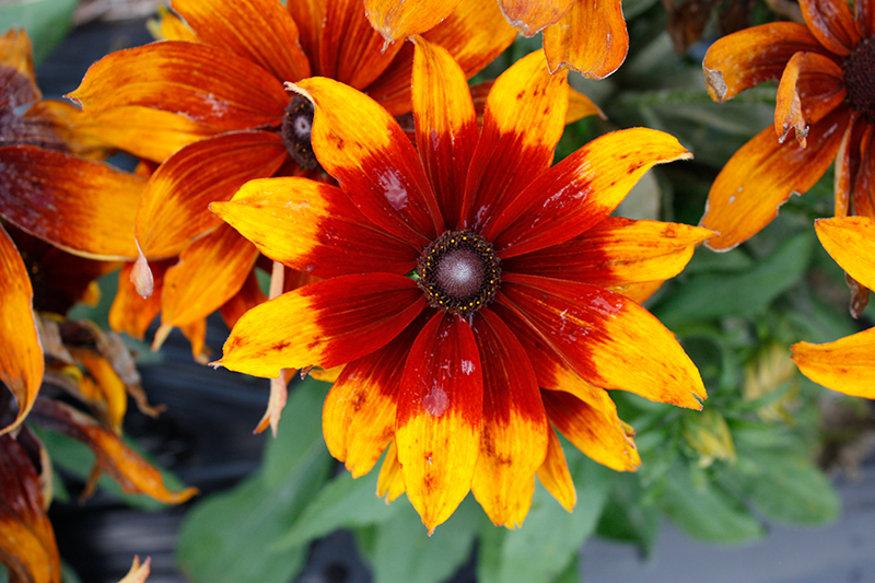 An intergeneric cross with the appearance of Rudbeckia, and the hardiness of Echinacea; long lasting, huge scarlet-orange flowers with gold tips and dark brown centers with a long blooming season; perfect for borders or containers; high disease resistance
