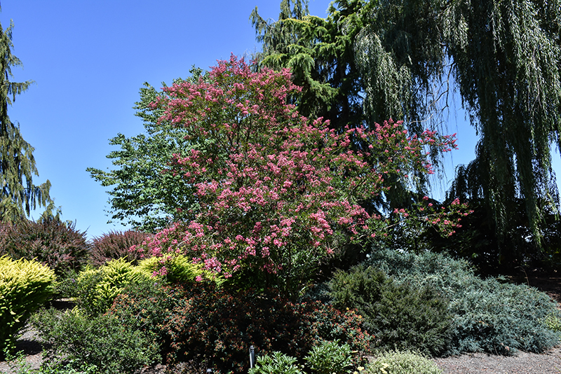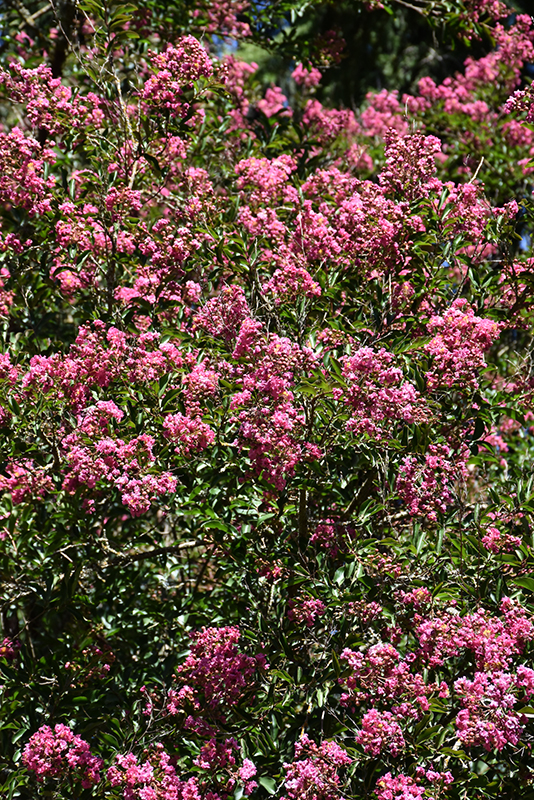 This remarkable crapemyrtle produces large trusses of frilly pink blooms over shiny dark green foliage; excellent mildew resistance and improved hardiness; a captivating focal point in the garden or border; can be maintained as a small, multi-stemmed tree