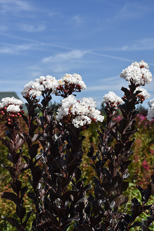 Summerlasting™ Coconut Crapemyrtle is clothed in stunning panicles of white frilly flowers at the ends of the branches from late spring to late summer, which emerge from distinctive dark red flower buds. It has attractive black foliage with hints of burgundy which emerges brick red in spring. The glossy oval leaves are highly ornamental and turn outstanding shades of burgundy and dark red in the fall. The dark red stems can be quite attractive.