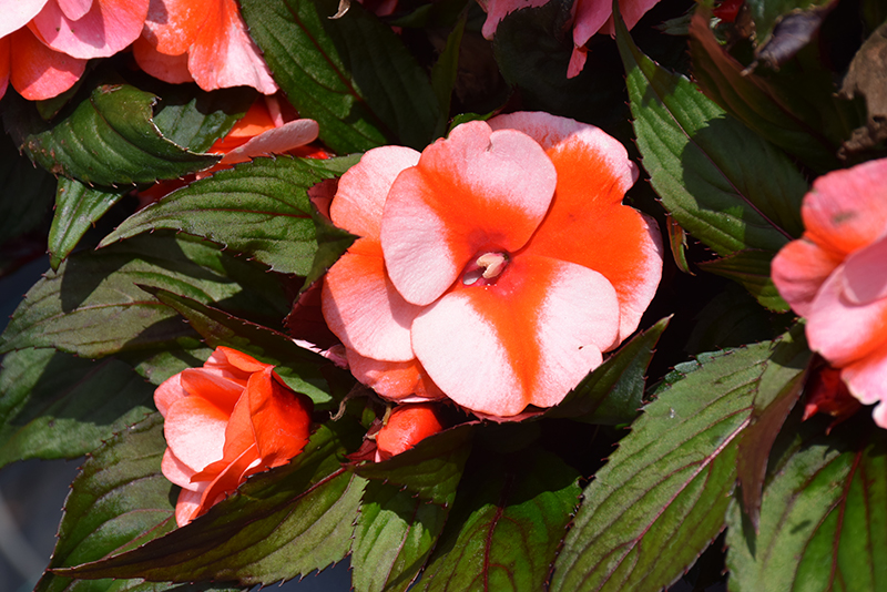 Petticoat® Orange Star New Guinea Impatiens features bold orange round flowers with peach overtones at the ends of the stems from mid spring to early fall. Its pointy leaves remain dark green in colour throughout the season.