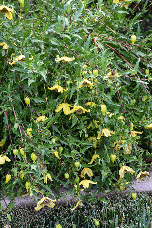 Mongolian Gold Clematis features bold nodding gold recurved flowers with yellow overtones at the ends of the stems from late spring to early fall. Its oval leaves remain dark green in colour throughout the season. The brick red stems can be quite attractive.