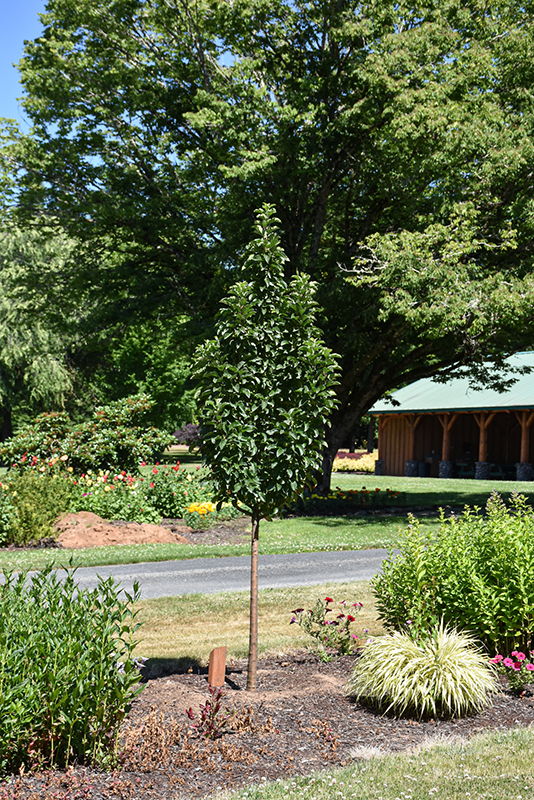 A stunning selection with a tightly columnar habit and excellent disease resistance; white flowers from deep pink buds in spring; bright, cherry red fruit persists into late autumn; dark green foliage offers tones of yellow in fall