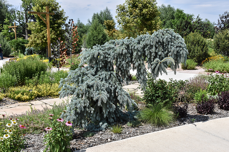 Blue Falls™ Spruce is a dense multi-stemmed evergreen shrub with a rounded form and gracefully weeping branches. Its average texture blends into the landscape, but can be balanced by one or two finer or coarser trees or shrubs for an effective composition.