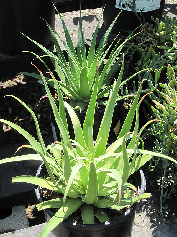 An upright selection producing vertical, arching, spineless lime green leaves with a pale band down the center; infrequent towering spikes with clusters of yellow-green flowers when rosettes mature; a great accent for rockeries or dry gardens