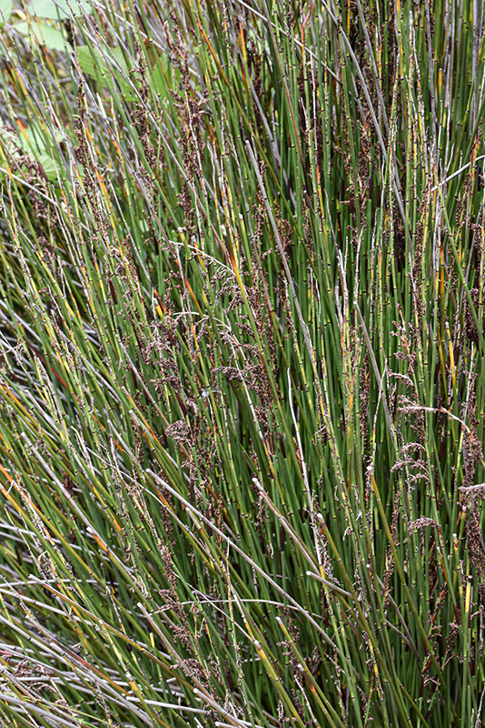 A dense, tufted clump of short, unbranched, dark green stems; brown sheaths at the joints drop off in summer, leaving dark nodes; clusters of dark brown flowers appear at the tips in summer to fall; drought tolerant, but appreciates water in spring