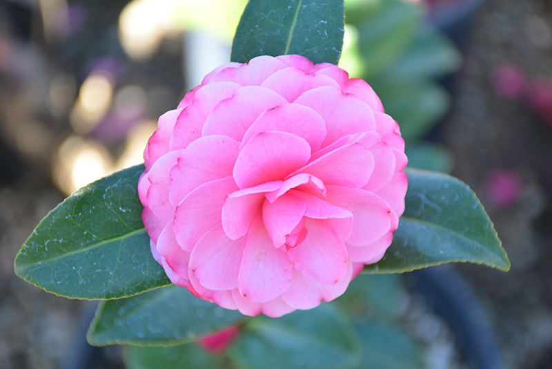 Lustrous evergreen foliage cover this upright shrub; masses of striking lavender-rose, formal double flowers that start blooming in early fall, through mid-winter; provide rich, acidic, moist, well-drained soil