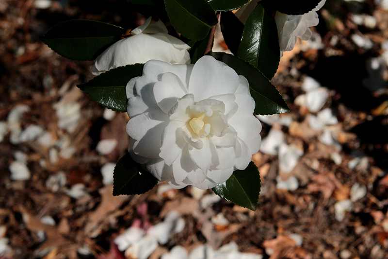October Magic® Bride™ Camellia features showy double white round flowers with buttery yellow eyes at the ends of the branches from mid to late fall. It has dark green evergreen foliage. The small glossy pointy leaves remain dark green throughout the winter.