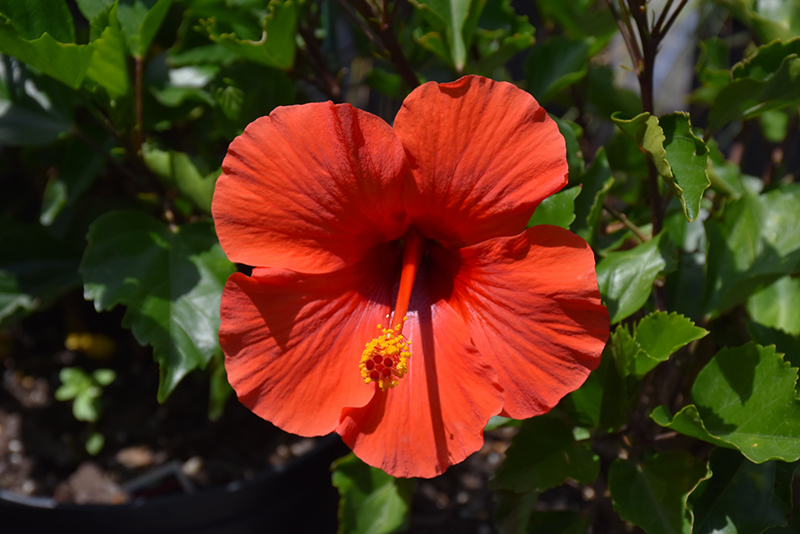 Red Dwarf Hibiscus features bold scarlet round flowers with orange overtones, dark red eyes and gold anthers at the ends of the branches from late spring to late fall. Its glossy pointy leaves remain dark green in colour throughout the year.