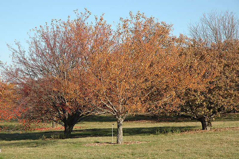 An impressively tough and durable flowering tree with pretty white flowers in spring followed by bright yellow fruit with a reddish blush in fall on an upright branched form, extremely disease resistant variety, a nice character tree