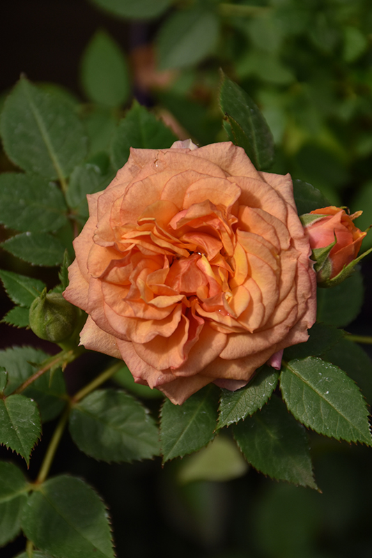 Elegant buds and flowers of apricot and salmon sit above deep green foliage; upright, compact habit, great for small spaces, garden beds, borders and patio containers; lightly fragrant with the scent of fruit and citrus