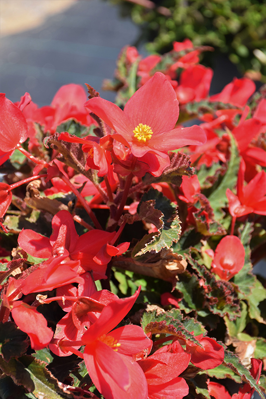A standout, upright begonia with striking color and bold foliage; vibrant cerise red blooms on a vigorous, well branched plant all season long; grows well in hot and humid conditions; great for containers, hanging baskets or garden landscapes