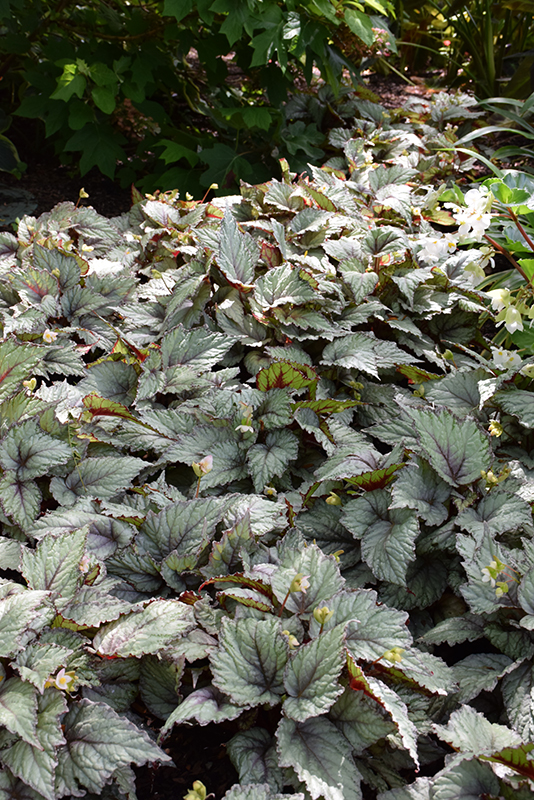Jurassic Snowfall Begonia's attractive large crinkled heart-shaped leaves emerge grayish green in spring, turning silver in colour with distinctive burgundy veins and tinges of crimson the rest of the year on a plant with an upright spreading habit of growth.