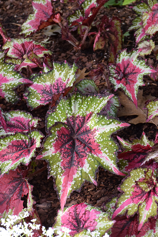 An outstanding begonia presenting large, exotic leaves with red centers surrounded by emerald green and white polka dots; lovely pink flowers are produced throughout the season; grows well in humid conditions