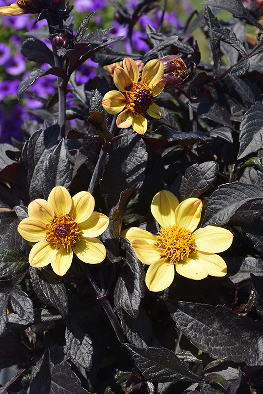 Happy Days™ Yellow Dahlia features showy yellow daisy flowers with dark brown eyes and gold anthers at the ends of the stems from mid spring to early fall. The flowers are excellent for cutting. Its attractive serrated pointy leaves remain black in colour with showy dark green variegation throughout the season. The dark red stems can be quite attractive.