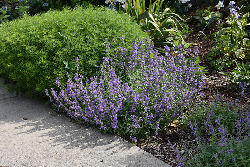 Little Titch Catmint will grow to be about 8 inches tall at maturity, with a spread of 12 inches. Its foliage tends to remain low and dense right to the ground. It grows at a medium rate, and under ideal conditions can be expected to live for approximately 10 years. As an herbaceous perennial, this plant will usually die back to the crown each winter, and will regrow from the base each spring. Be careful not to disturb the crown in late winter when it may not be readily seen!