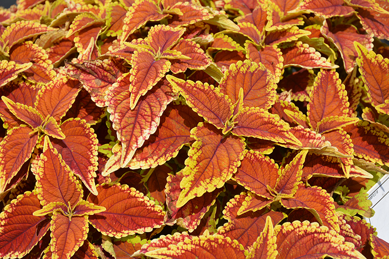 This colorful selection presents orange-red leaves with lime green edges and copper overtones; great for sun or shade, with a tidy, upright mounded habit; late flowering; perfect for gardens, containers, hanging baskets and mixed borders