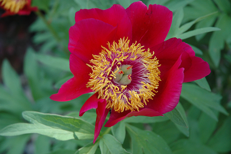 Mermaid Gem Peony features bold lightly-scented cherry red cup-shaped flowers with yellow eyes at the ends of the stems from mid to late spring. The flowers are excellent for cutting. Its compound leaves remain green in colour throughout the season.