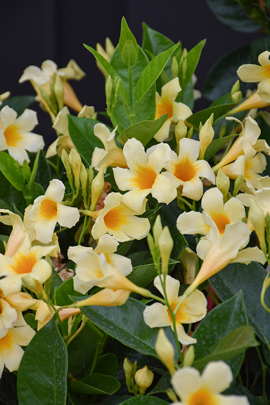 Calypso Limone Mandevilla features bold yellow tubular flowers with gold throats along the branches from late spring to mid fall. Its glossy pointy leaves remain dark green in colour throughout the year.
