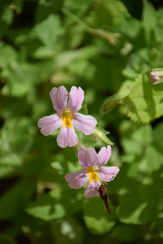 Monkeyflower features showy clusters of lightly-scented shell pink trumpet-shaped flowers with hot pink overtones, yellow throats and hot pink spots along the stems from late spring to late summer. Its narrow leaves remain dark green in colour throughout the season.
