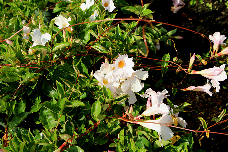 Flordenia White Mandevilla is a multi-stemmed evergreen tropical plant with a mounded form. Its medium texture blends into the garden, but can always be balanced by a couple of finer or coarser plants for an effective composition.