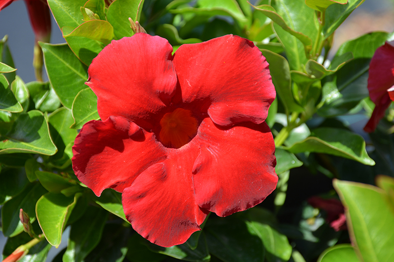 Magnetica® Red Mandevilla features bold red tubular flowers with gold throats along the branches from late spring to mid fall. Its glossy pointy leaves remain green in colour throughout the year.