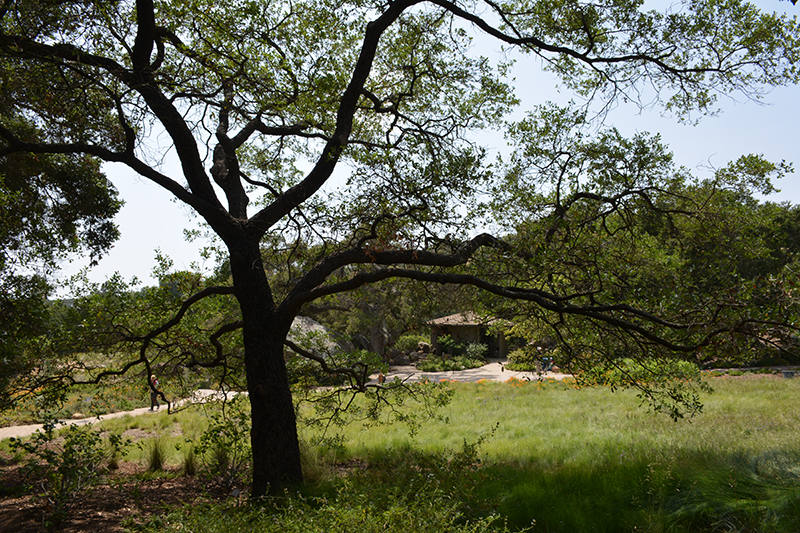 A medium-sized shade tree with a short trunk, spreading branches and a sparse crown, features leathery, oval blue-green leaves with wavy edges; best in large landscapes; a California native that is generally evergreen but may be drought deciduous