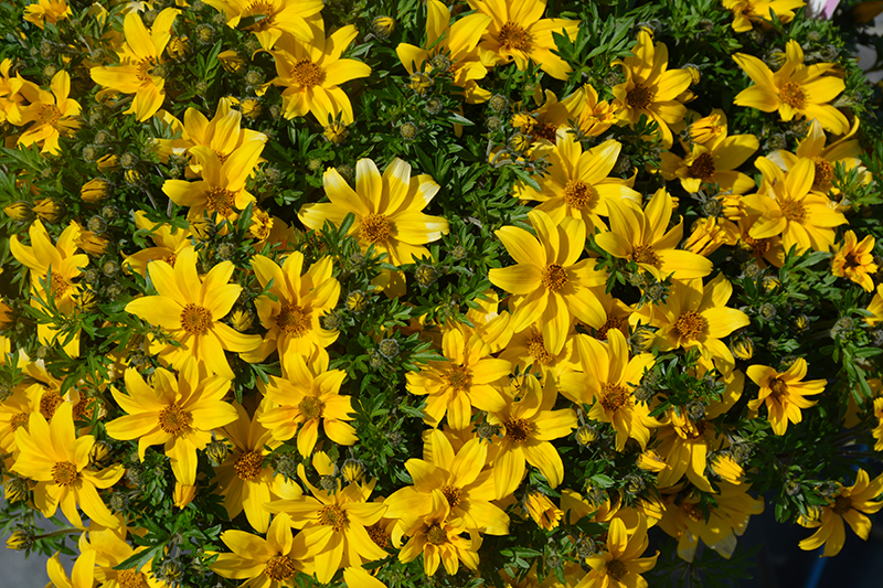 Sun Drop Yellow Bidens has masses of beautiful yellow daisy flowers at the ends of the stems from late spring to mid fall, which are most effective when planted in groupings. Its tiny deeply cut ferny leaves remain green in colour throughout the season.