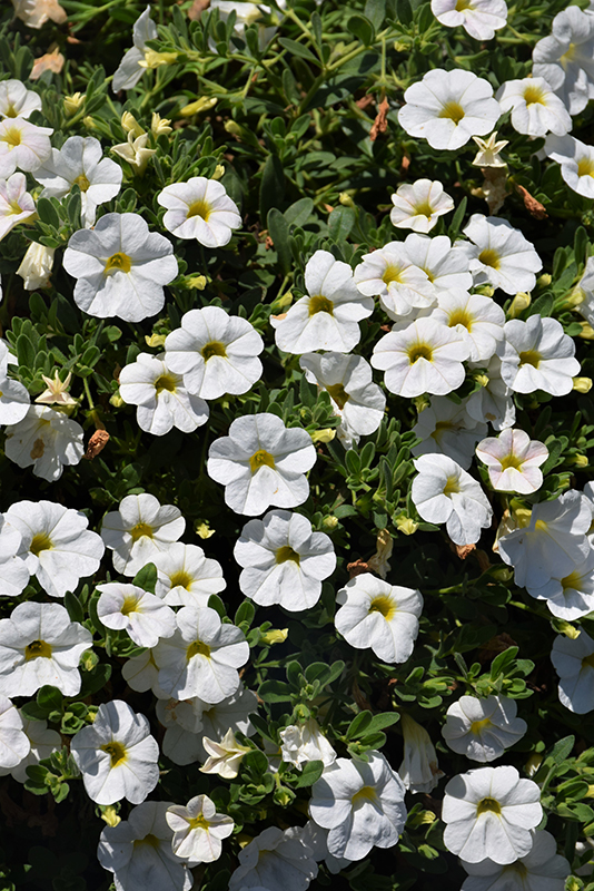 Lia™ Glaze Calibrachoa is blanketed in stunning white trumpet-shaped flowers with yellow throats at the ends of the stems from late spring to early fall. Its small pointy leaves remain green in colour throughout the season.