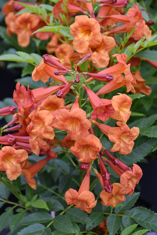 Kalama™ Pomegranate Esperanza features showy clusters of orange trumpet-shaped flowers with scarlet overtones and gold throats along the branches from early to late summer. Its serrated pointy leaves remain green in colour throughout the year.