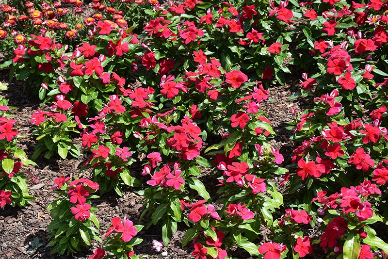 Titan-ium™ Dark Red Vinca features showy dark red star-shaped flowers at the ends of the stems from late spring to mid fall. Its glossy oval leaves remain dark green in colour throughout the year.
