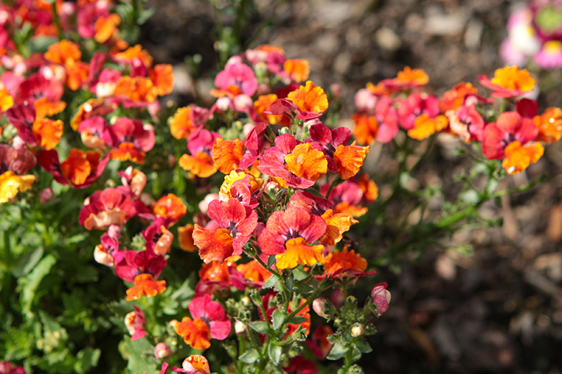Nesia™ Tangerine Nemesia will grow to be about 12 inches tall at maturity, with a spread of 10 inches. When grown in masses or used as a bedding plant, individual plants should be spaced approximately 12 inches apart. Its foliage tends to remain dense right to the ground, not requiring facer plants in front. This fast-growing annual will normally live for one full growing season, needing replacement the following year.