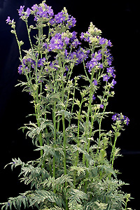 Snow And Sapphires Jacob's Ladder will grow to be about 12 inches tall at maturity extending to 24 inches tall with the flowers, with a spread of 18 inches. When grown in masses or used as a bedding plant, individual plants should be spaced approximately 15 inches apart. Its foliage tends to remain dense right to the ground, not requiring facer plants in front. It grows at a medium rate, and under ideal conditions can be expected to live for approximately 10 years. As an herbaceous perennial, this plant will usually die back to the crown each winter, and will regrow from the base each spring. Be careful not to disturb the crown in late winter when it may not be readily seen!