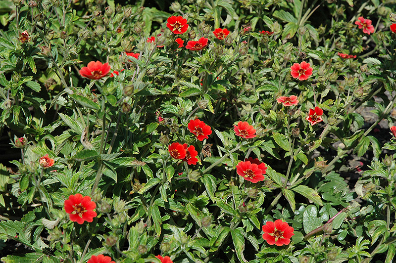 Gibson's Scarlet Cinquefoil will grow to be about 10 inches tall at maturity, with a spread of 12 inches. When grown in masses or used as a bedding plant, individual plants should be spaced approximately 9 inches apart. Its foliage tends to remain low and dense right to the ground. It grows at a medium rate, and under ideal conditions can be expected to live for approximately 10 years. As an herbaceous perennial, this plant will usually die back to the crown each winter, and will regrow from the base each spring. Be careful not to disturb the crown in late winter when it may not be readily seen!