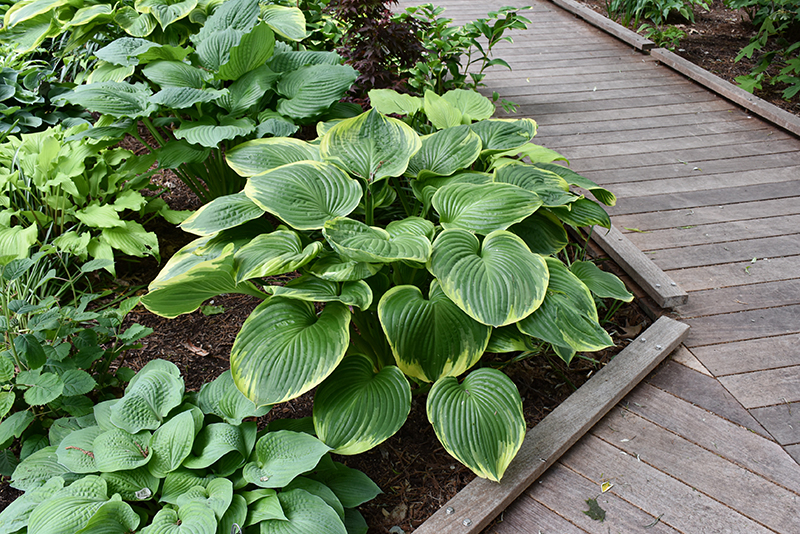 This selection features large, green, oval to heart shaped leaves with creamy-yellow margins; forms an upright, spreading mound in the landscape; provides beautiful texture and contrast to other plants; white -pale lavender spikes of flowers in mid summer