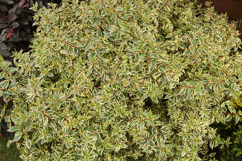 This compact shrub displays colorful foliage with new growth emerging in shades of pink and green with yellow margins; tidy, mounded habit and fragrant tubular white flowers in summer; great choice for borders, containers or low hedges