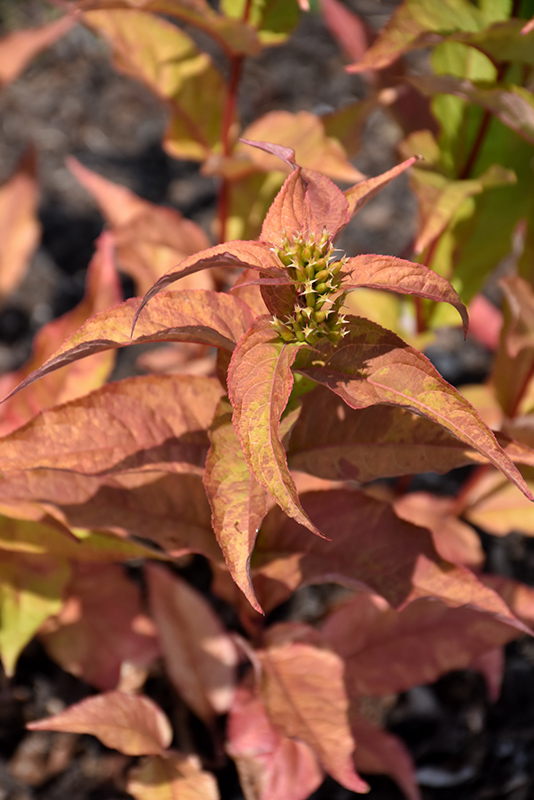 Kodiak Spiced™ Diervilla features showy panicles of yellow trumpet-shaped flowers along the branches from early to mid summer. It has chartreuse foliage with hints of coppery-bronze which emerges orange in spring. The pointy leaves turn outstanding shades of orange, coppery-bronze and red in the fall.