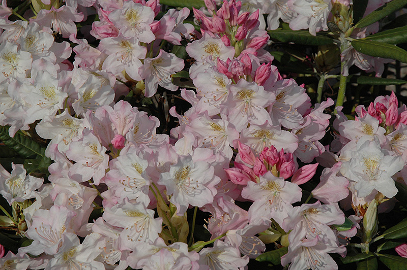 A compact and wide-spreading evergreen rhododendron with the prettiest flowers in the softest pink imaginable, fading to white; absolutely must have well-drained, highly acidic and organic soil, use plenty of peat moss when planting