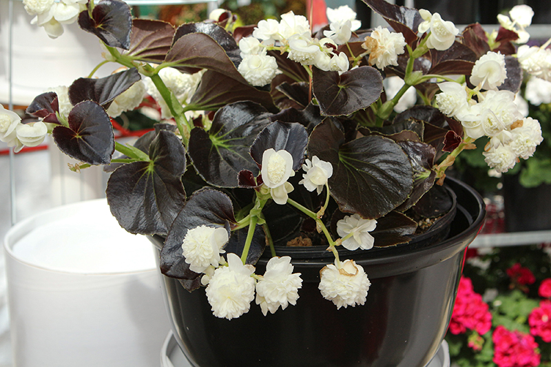 An outstanding shrub type variety that features clusters of large, creamy-white double flowers, contrasting against dark chocolate brown foliage; large upright plants perform wonderfully in patio containers, hanging baskets, and garden beds