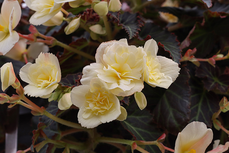 I'Conia® Tweety Pie Begonia features bold double buttery yellow frilly flowers at the ends of the stems from late spring to early fall. Its heart-shaped leaves remain dark green in colour with distinctive light green veins and tinges of dark red throughout the year.