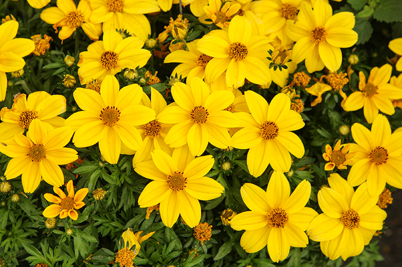 Bidy Boom Sunglow Bidens has masses of beautiful yellow daisy flowers with gold centers at the ends of the stems from late spring to mid fall, which are most effective when planted in groupings. Its deeply cut ferny leaves remain green in colour throughout the season.