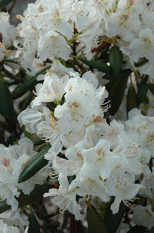 A stunning broadleaf evergreen shrub that produces an abundance of frilly white flowers with maroon purple blotches in spring on a compact plant; absolutely must have well-drained, highly acidic and organic soil, use plenty of peat moss when planting