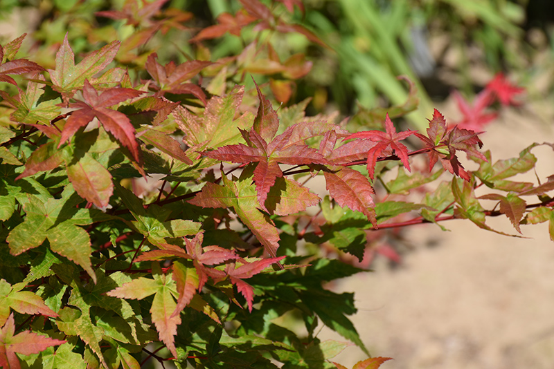 Beni Komachi Japanese Maple is primarily valued in the landscape or garden for its cascading habit of growth. It has attractive red-variegated green foliage with hints of coppery-bronze which emerges red in spring. The small twisted lobed palmate leaves are highly ornamental and turn outstanding shades of scarlet and in the fall. It produces red samaras from early to mid fall. The rough gray bark and red branches add an interesting dimension to the landscape.