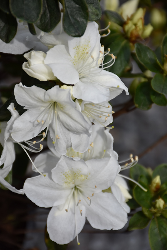Encore® Autumn Dove® Azalea is bathed in stunning clusters of lightly-scented white trumpet-shaped flowers at the ends of the branches from late spring to early fall. It has dark green evergreen foliage. The glossy narrow leaves remain dark green throughout the winter.