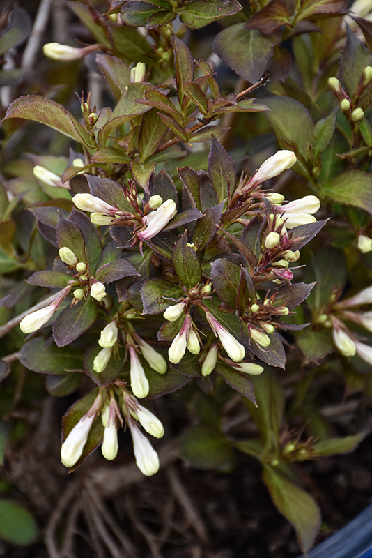 Afterglow™ Weigela features showy clusters of creamy white trumpet-shaped flowers with pink overtones along the branches in late spring. It has attractive dark green foliage with hints of coppery-bronze. The pointy leaves are highly ornamental but do not develop any appreciable fall colour.