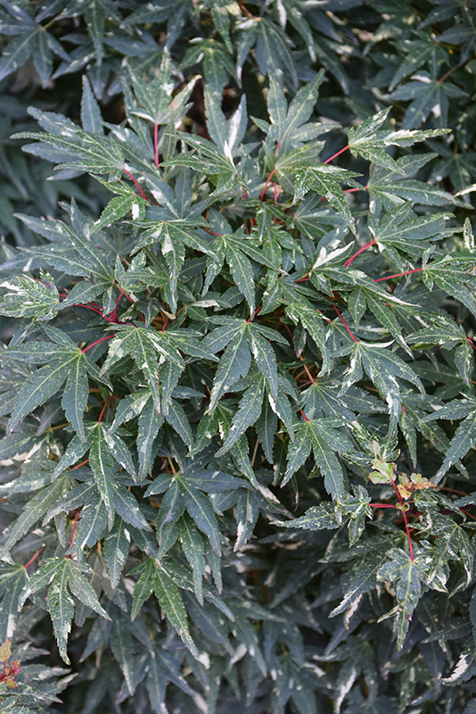 Ryugu Dwarf Japanese Maple is primarily valued in the landscape or garden for its interestingly mounded form. It has attractive creamy white-variegated green foliage which emerges orange in spring. The tiny serrated lobed palmate leaves are highly ornamental and turn an outstanding red in the fall. The red branches are extremely showy and add significant winter interest.