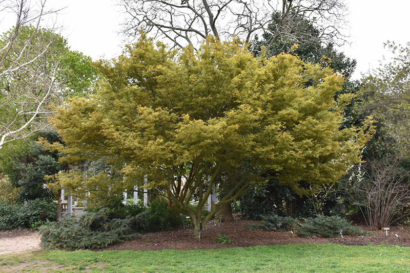 A beautiful, fast growing selection with a bronze blush on emerging foliage that is deeply divided and serrated; bright crimson red fall color; has a strong upright habit with dense branching, makes a fantastic accent tree for the front yard