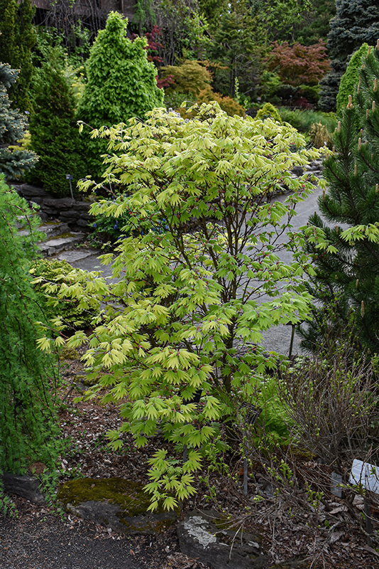 Ogurayama Full Moon Japanese Maple is primarily valued in the landscape or garden for its ornamental upright and spreading habit of growth. It has attractive light green foliage with hints of chartreuse which emerges olive green in spring. The fuzzy lobed palmate leaves are highly ornamental and turn outstanding shades of yellow, orange and red in the fall. The rough gray bark and dark red branches add an interesting dimension to the landscape.
