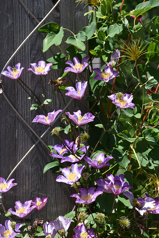 An exciting clematis with purple flowers imbued with shades of rich and deep pink throughout; a vigorous and prolific bloomer, just the plant to add softness and color to a fence, arbor or other structure
