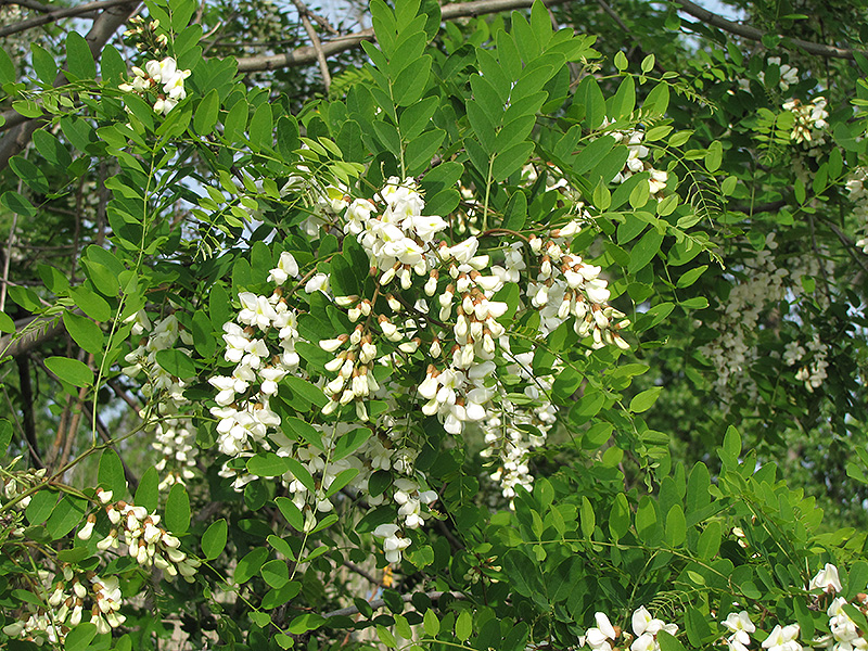 Black Locust has chains of fragrant creamy white pea-like flowers with yellow eyes hanging below the branches in late spring. It has bluish-green deciduous foliage. The oval pinnately compound leaves turn yellow in fall.