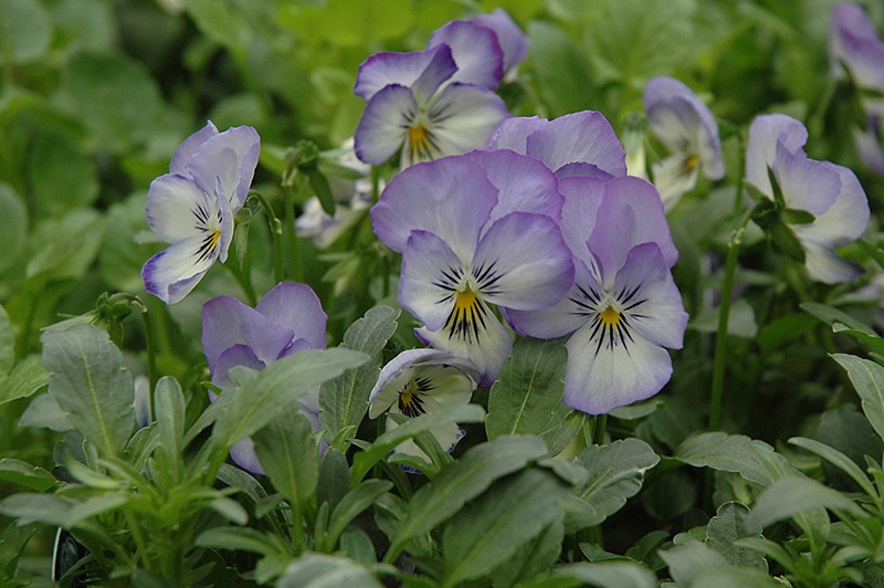 Coconut Swirl Sorbet Pansy has masses of beautiful purple flowers with white overtones, yellow eyes and indigo stripes at the ends of the stems from early spring to late fall, which are most effective when planted in groupings. Its crinkled round leaves remain green in colour throughout the season.